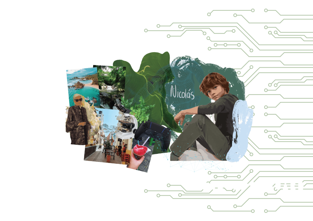 Nicolas, a boy aged 10 to 14 from Bogotá,  South America, embodies a sweet and affectionate personality. He cherishes his time with family and friends, feeling free to express his thoughts, which brings him immense tranquility and joy. While he is deeply connected to nature and finds excitement in exploring it, Nicolas also embraces the technological world of his upbringing. He enjoys playing video games and indulging in technology, but he equally delights in going on adventures and spending quality time at his grandmother’s house in Santa Marta, a coastal city in Colombia known for its abundant beaches and adventurous natural surroundings. Growing up in an era defined by technology, Nicolas has seamlessly integrated various electronic devices into his daily routine. These gadgets not only provide entertainment but also serve as tools for learning, information sharing, and capturing cherished memories of his adventures.