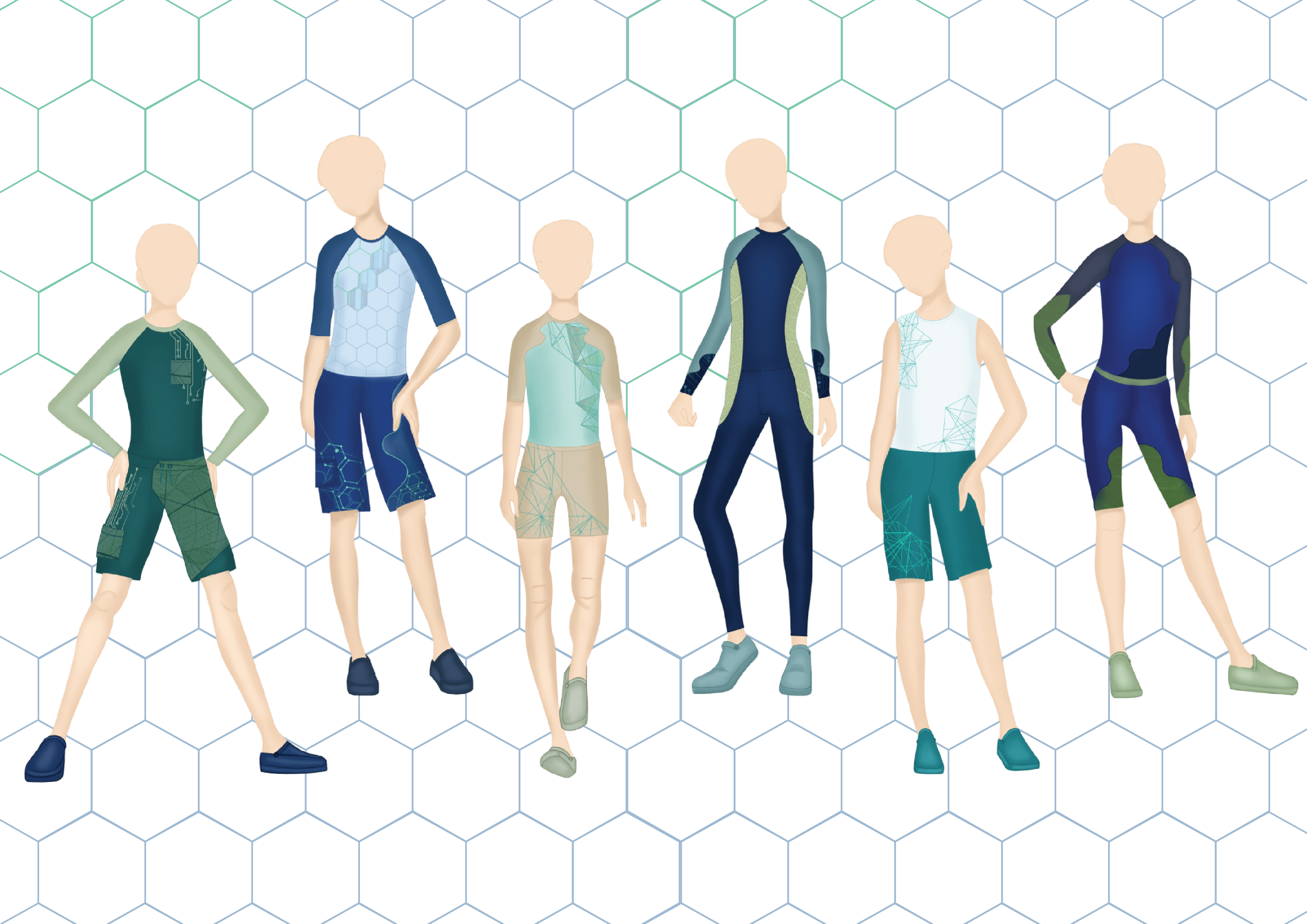 Welcome to a journey where nature merges with technology and digital innovation in a collection inspired by Generation Alpha, those who live amidst the exuberance of nature and the omnipresence of technology. With six swimwear looks, Digitalized Nature embraces fun and functionality in each garment, from vibrant beach shorts to elegant surf suits, carefully crafted to reflect the dynamic and versatile essence of our young consumers. Join us on this journey as we explore a universe where colors come to life, shapes transform, and fashion becomes an authentic expression of the adventurous spirit of modern youth.